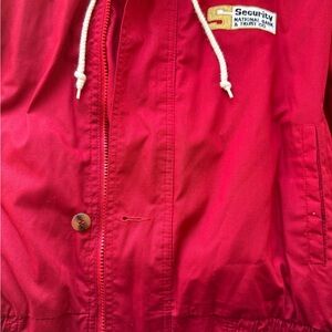 Immaculate vintage red Men's Jacket. Perfect for any occasion. classic look with its vibrant red color. Hoodie is still in tact and zips inside collar! Impeccable find. Pockets. Zipper and buttons. Elastic waist.