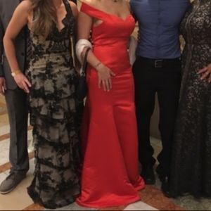 Stunning red floor length gown in trumpet/mermaid style. Perfect for holiday events, Black tie, galas etc! Off the shoulder with hook closure support inside. Size 6. I am 5’ 4”, wore it with 3-4 inch heels. Comment for measurements if needed.