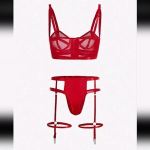 Red Mesh & Straps Zippered Front 2pc Lingerie Set With Garters (S)