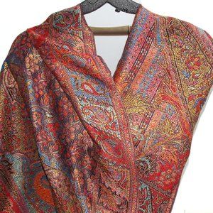 Red sparkling scarf with paisley and floral print. Shinny thread in between to give it a festive look. Good for evening parties, weddings and other formal events yet light weight enough to be used casually.