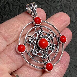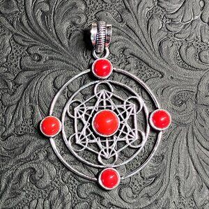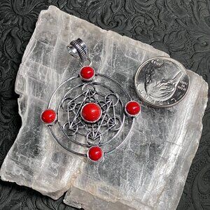 Pendant of 5 red stones in a 925 silver plated metratrons cube setting.
