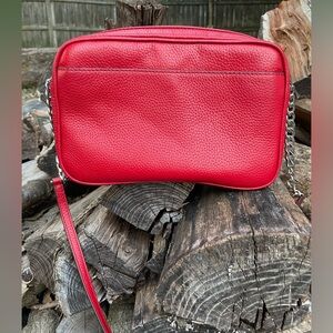 Just like new, pebbled leather, silver-tone hardware, top-zip closure, adjustable crossbody strap, 1 back slip pocket, 2 interior slip pockets, lining.