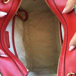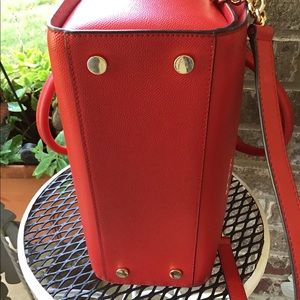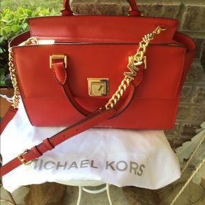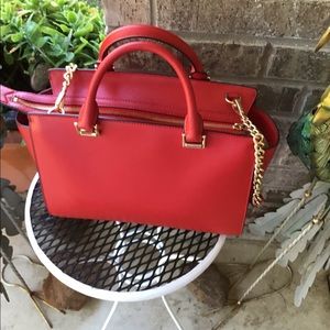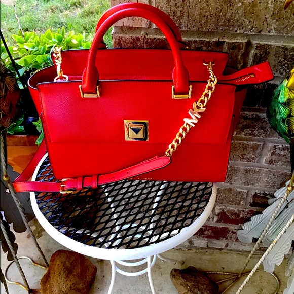Stylish red handbag featuring gold accents and a chain strap. Perfect for any occasion.