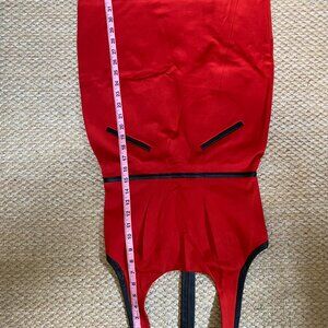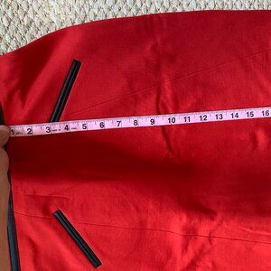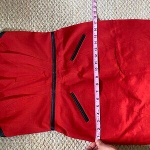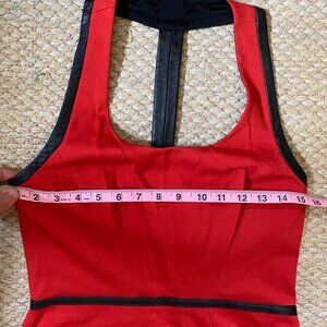 Red mini halter dress with black pleather trim