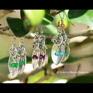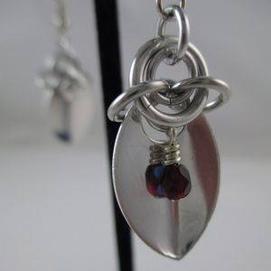 Brilliant Red beads against a mirror scale to really make them glimmer. Held by a simple modified European 4 in 1 pattern to create a showcase as they dangle. Made with a lightweight mirror aluminum, you will hardly notice them hanging from your ears. Hangs from a nickel ear hook with a rubber backing to keep them in place. Other colors not included.