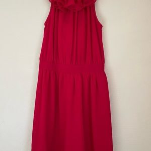 Super cute red ModCloth dress purchased a few years ago and worn once for a wedding. The neck is ruffled and the dress is slightly short, falls a little above my knee and I am 5’ 3”.