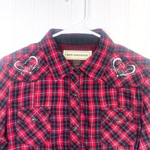 Bit & Bridle Flannel Women's Large Rodeo Pearl Snap Western Shirt Cowgirl Show.