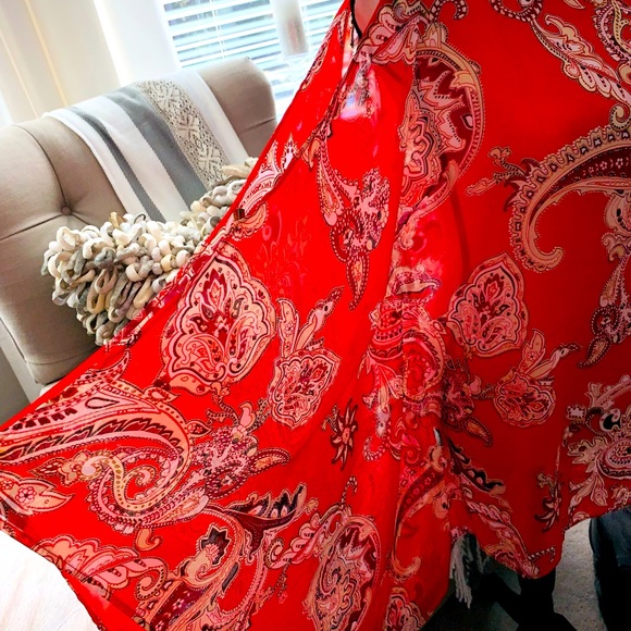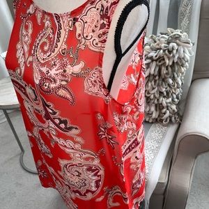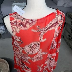 Red multi blouse with no sleeve on one side Cold shoulder on the other side with dramatic look.
