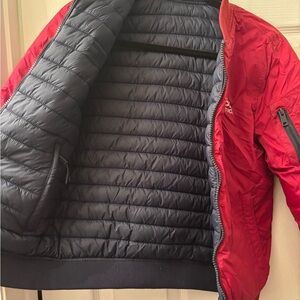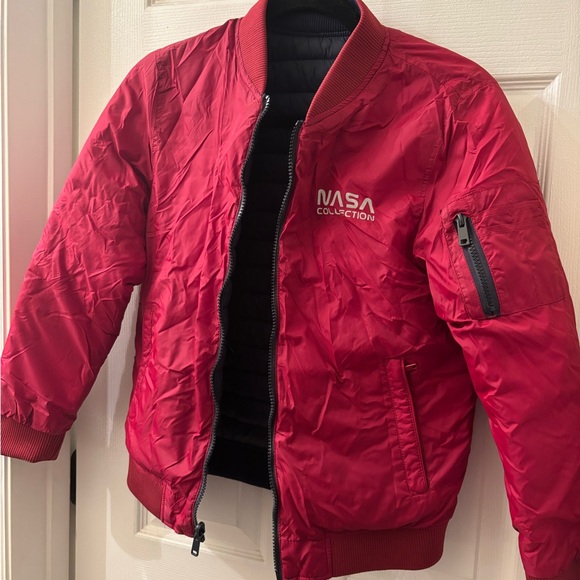 Stylish red bomber jacket with NASA Collection logo. Features zippered sleeve pocket.