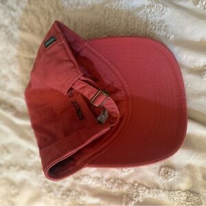 Red cap featuring Nantucket embroidery. Comfortable and stylish.