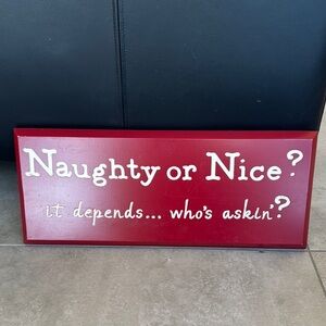 Red wooden sign with 'Naughty or Nice?' text. Perfect for holiday decor. Very nice used condition as decoration for a season.