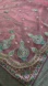 Vibrant red sheer net saree with embroidery and sequin work. The boarder had a purple, green, and gold pattern while the inner fabric had sequin flowers. Blouse fabric is attached with the saree and there is separate copper red petticoat fabric. Petticoat is unstitched.