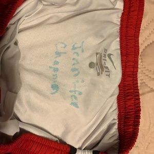 These shorts are a child xL but fit an adult small. They are in great condition because I didn’t wear them much. There is my name in sharpie in them but luckily it’s not visible when you are wearing them!