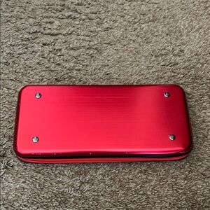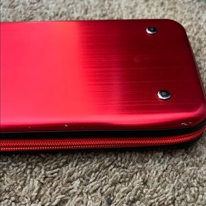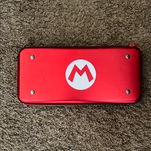 Red Nintendo Switch carrying case with a bold logo. Durable and stylish for gamers. Minor wear and scratches. Shown in pictures.