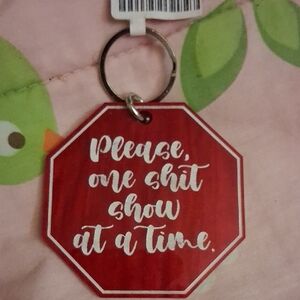 Red octagonal keychain featuring a humorous quote. Perfect for adding a touch of fun to your keys.