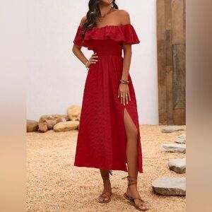 Add a touch of romance to your summer ensemble with our red midi dress. The off-shoulder design and short sleeves create a flirty and feminine look, while the side leg slit adds a hint of allure, allowing you to show off some skin in style.