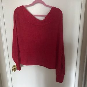 This red off the shoulder Free People sweater has been gently worn and loved. Slight hole on back of sweater near neck as pictured. Fashionably baggy and perfect for all seasons.