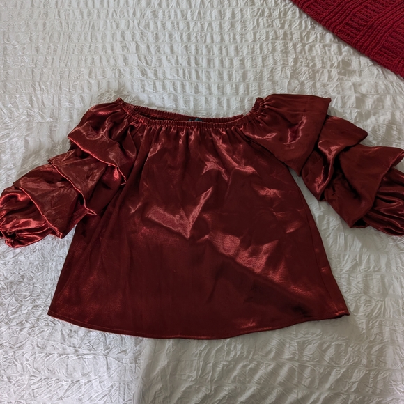 Stylish red off-shoulder blouse with ruffle sleeves. Perfect for a chic look.