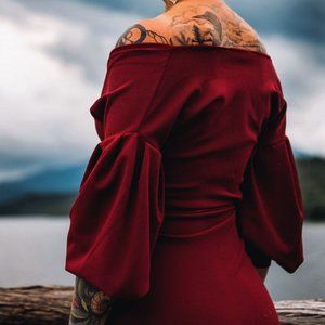 Amazingly sexy off-the-shoulder bodycon dress with poof sleeves. Can also be worn as a v-neck too. Sadly, I no longer fit in this. Has only been worn maybe 1-3 times, and is in used great condition. One tiny stain on the left sleeve, barely noticeable. Is very stretchy, and has no zip/closure, just goes over the head. Pics on me at 5'3", and measurements at the time: 32B bust, 25" waist & 34" hip.