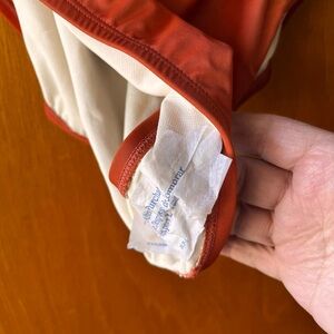 Stylish red one-piece swimsuit with a front tie detail. Perfect for beach days.