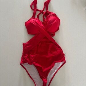 Eye-catching red one-piece swimsuit featuring a padded top, crisscross front detail, and open back with strappy design. Stylish and supportive.