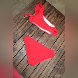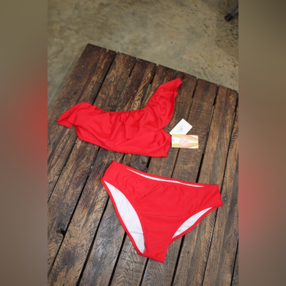 Bold and eye-catching red bikini set featuring a trendy one-shoulder top with ruffle detail for a fun, feminine touch. Paired with matching classic-cut bottoms for a flattering and comfortable fit.