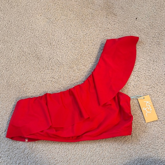 Super cute and stylish one shoulder ruffle red bikini top. BNWT, size L I also have the same exact top in M check out the other listing! Perfect to match with any bottom, fits like a glove. Bought too many and need to purge!