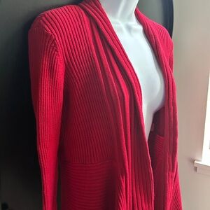 Stylish and vibrant red open-front cardigan sweater. Perfect for layering, this sweater adds a pop of color to any outfit. Like-new and coming from a smoke-free home.