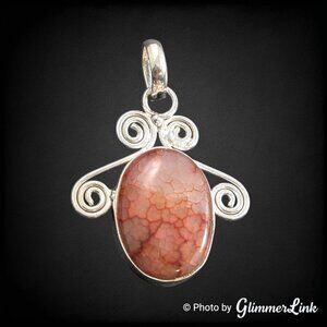 Red Orange Dragon Vein Oval Cabochon Scrollwork Silver Plated Pendant