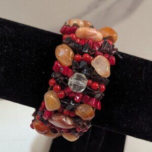 Red & Orange Gemstone Beads Clamp Bracelet Woven Boho Style Handmade Adjustable