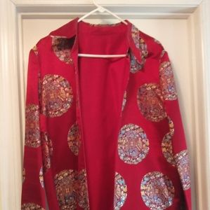 BEAUTIFUL red lined red and gold patterned Oriental Jacket. Long sleeve elegance to top dress skirt or pants...open no buttons.