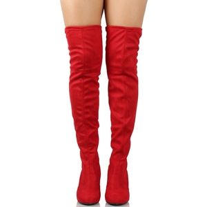 Red faux suede over the knee block heel boot with back tie. Heel approx 3 3/4 inch. Shaft height including heel approx 26” and opening circumference approx 16 1/2 ".Calf circumference is approx 14" . ( size 7 measurement) Pull up style. New with box . Model is a size 7 and a size 7 fits her perfectly