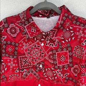 New! This striking red button-down shirt features a unique paisley bandana print on the upper half, contrasted by a solid red lower half. The long sleeves can be rolled up for a versatile look, and the comfortable fabric ensures all-day wearability. The intricate paisley design adds a touch of flair to any casual ensemble. This is from the boutique Knox & River New York. Size XL. My mom ordered this for a party and then didn’t use it. I actually have 2 available if you want to twin with a friend.