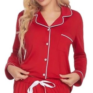Red Pajama Set long sleeve button down top and pants with white piping, XL