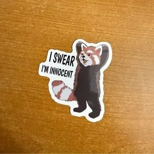 Cute red panda sticker with 'I Swear I'm Innocent' text. Perfect for decorating laptops or notebooks.