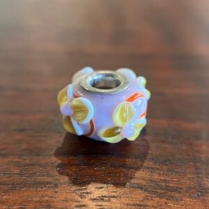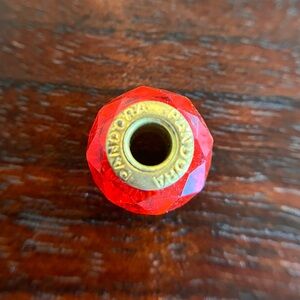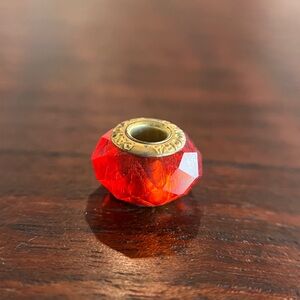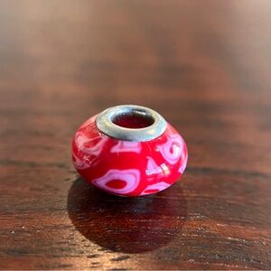 Bundle of five red and pink beads: one red Pandora faceted glass, one light pink glass with yellow flowers, one red glass with white circles, one silver with red crystals, one silver embossed. Price is firm
