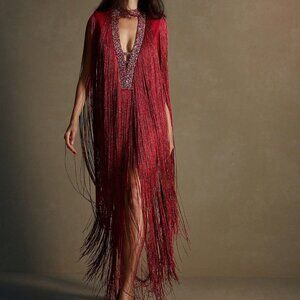 This party dress features a slim fit, bodycon silhouette in a vibrant red hue. The short, sleeveless design showcases a V-neck with a keyhole detail, while the bandage-style construction provides a fitted look. The dress is adorned with rhinestones and a fringe detail, perfect for making a statement at any party.
