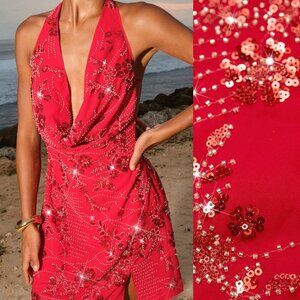 Red Party Women's Beaded Embroidered Fabric Halter Open Back Mini Dress