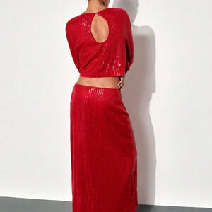 Red Party Women's Elegant Sparkling Sequin Side Slit Dress Set