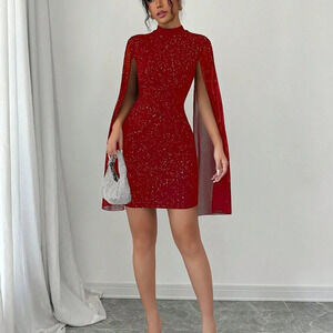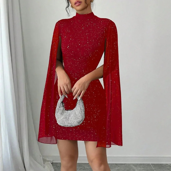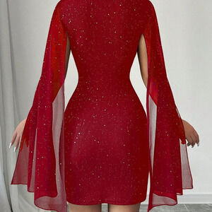 Red Party Women's Fitted Short Casual Mock Neck Flared Sleeve Bodycon Dress