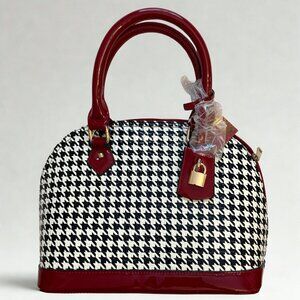 Brand-new satchel handbag with a classic black and white houndstooth pattern and bold red patent leather trim. Comes with a matching shoulder strap for versatility and features gold-tone details, including a decorative lock accent. Great for everyday wear or a standout statement piece.