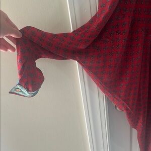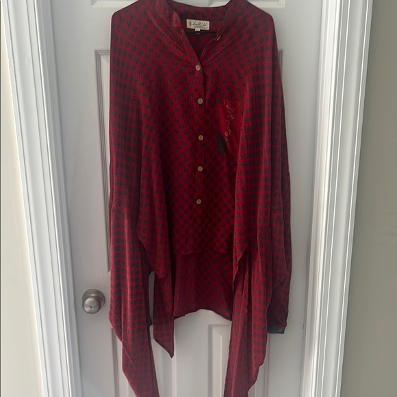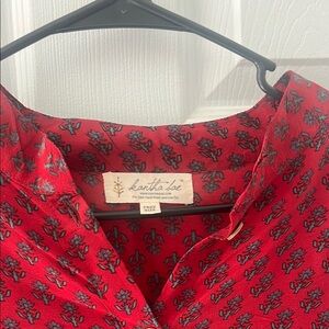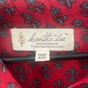 Kantha Bae free size. Stylish red patterned blouse with button-up front. Features a unique draped design that can be wrapped in a variety of ways.