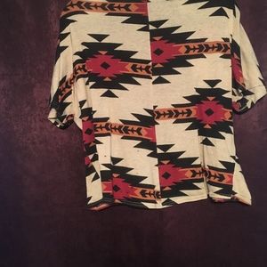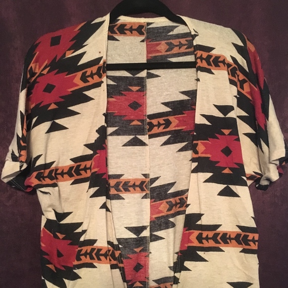 A light, short-sleeved cardigan with a fun, warm-toned pattern perfect for Fall! This piece was well-loved in my collection for a while, but it is still in great condition.