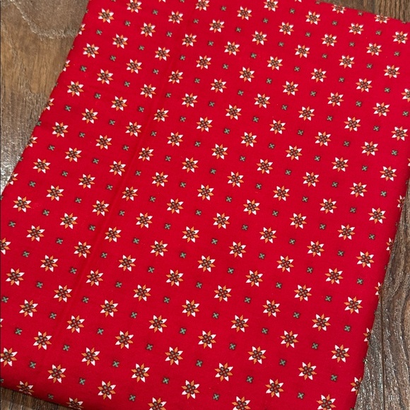 Vibrant red fabric with white, green and goldenrod pattern. Perfect for crafting or sewing projects. Cotton or cotton blend, 43” x 60”.