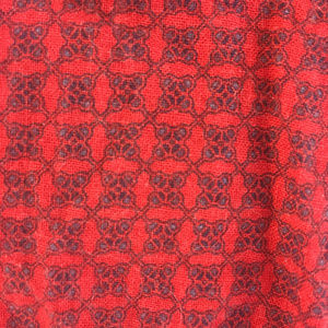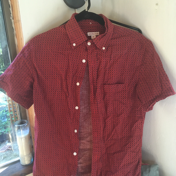 Red, short-sleeved, patterned button-up with contrasting buttons. Light-weight fabric. Excellent condition.