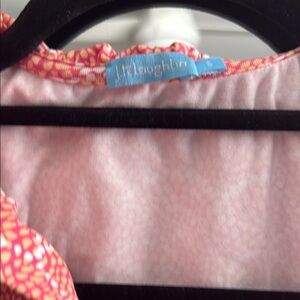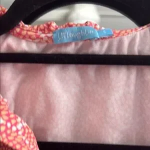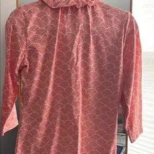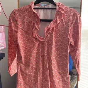 Stylish red blouse with a ruffle neckline. Features a unique pattern.