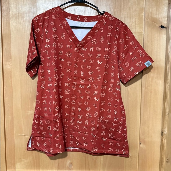 Scrubs bought on a boutique online called spurrin’. Never been worn as large is really a medium if you are a bigger chested girly. Burnt red with brands all over the top.