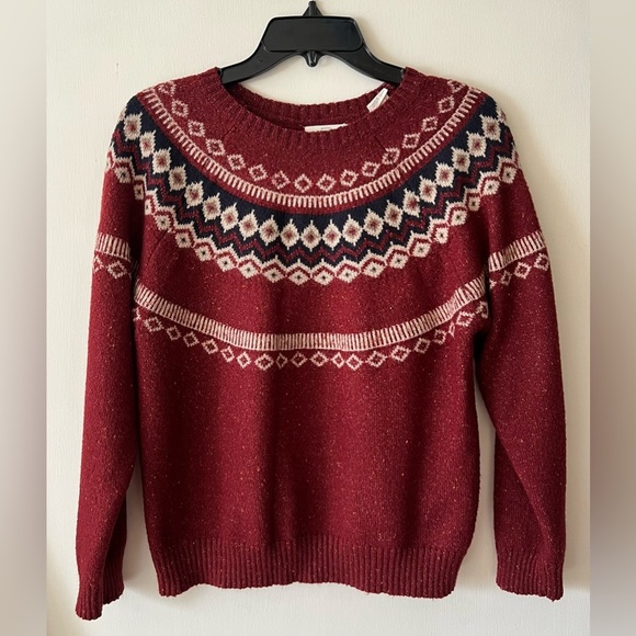 Cozy red sweater with intricate patterns. Perfect for chilly days.