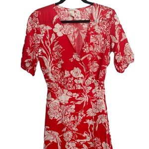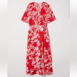 Calf-length dress in an airy Tencel™ lyocell weave with a V-neck with a concealed hook-and-eye fastener. Short sleeves and a seam at the waist with a double-layered wrapover skirt with a tie.