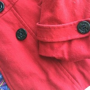 Delia's Red Pea Coay with black anchor buttons. Has colorful patterned lining inside. Perfect for fall and winter. Hardly ever been worn!